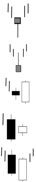 The Hammer can be either filled or hollow; the Japanese say the price is hammering out a bottom. What is important here is that at the end of a down move, the buyers and sellers test out an extreme low (the long shadow); however, by the closing bell, the price has returned higher.