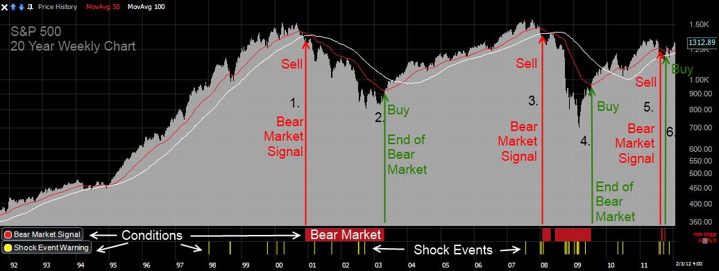 In November 2000, the system first flagged a Bear Market Signal (the first red vertical arrow). Selling all your stocks at this time would have meant you exited close to the top of the Dot-Com Bull market (only 9% off the top).