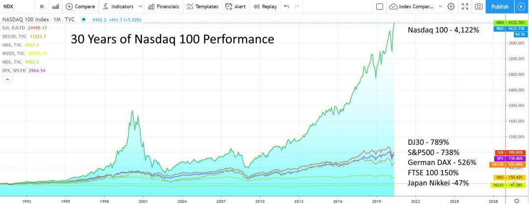 An excellent reason to invest in the NASDAQ 100 is that it simply outperforms all other major developed world indices, including the UK FTSE 100, the German DAX, France, Japan, and the MSCI world index. All major indices lose to the NASDAQ 100.